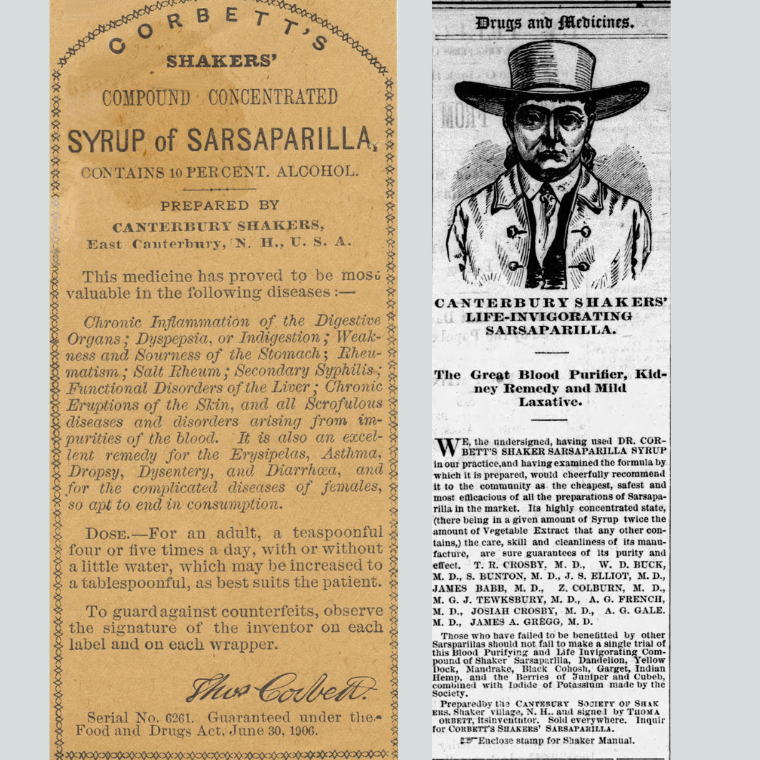 The Canterbury Shakers were widely known proponents of holistic medicine, and physicians and others visited them to learn about their reformist practices of health and medicine. In the 1790s, the Canterbury Shakers began and maintained a relationship with Dartmouth’s then-new medical school. In 1813, the Canterbury Shakers chose Brother Thomas Corbett (1780-1857) to train as a physician. Corbett then developed and managed the community’s popular medicinal herbal business that grew to serve the Northeast by the mid-nineteenth century. His medical inventions, such as an “electric generator,” sought to soothe the stiff and sore muscles caused by the physical labor in the community’s fields, gardens, mills, shops, and kitchens.
